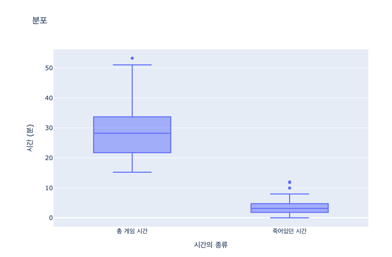 최근 게임 중 가장 길었던 판은 53분을 플레이 했고 가장 오래 죽어있던 시간은 11분이었습니다.