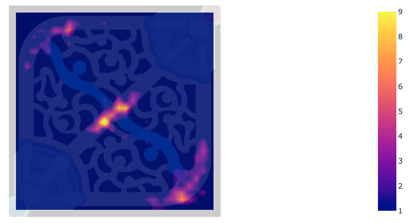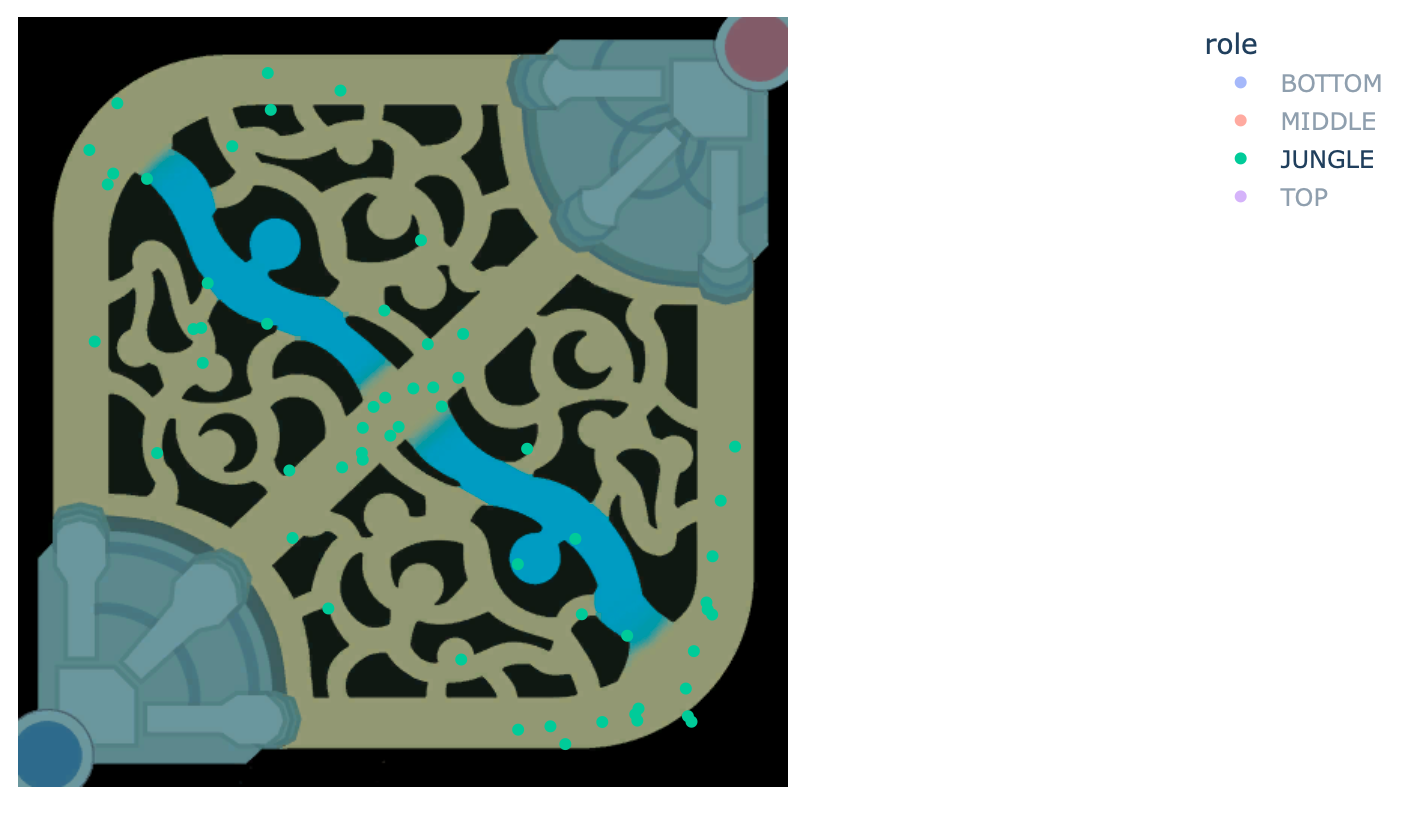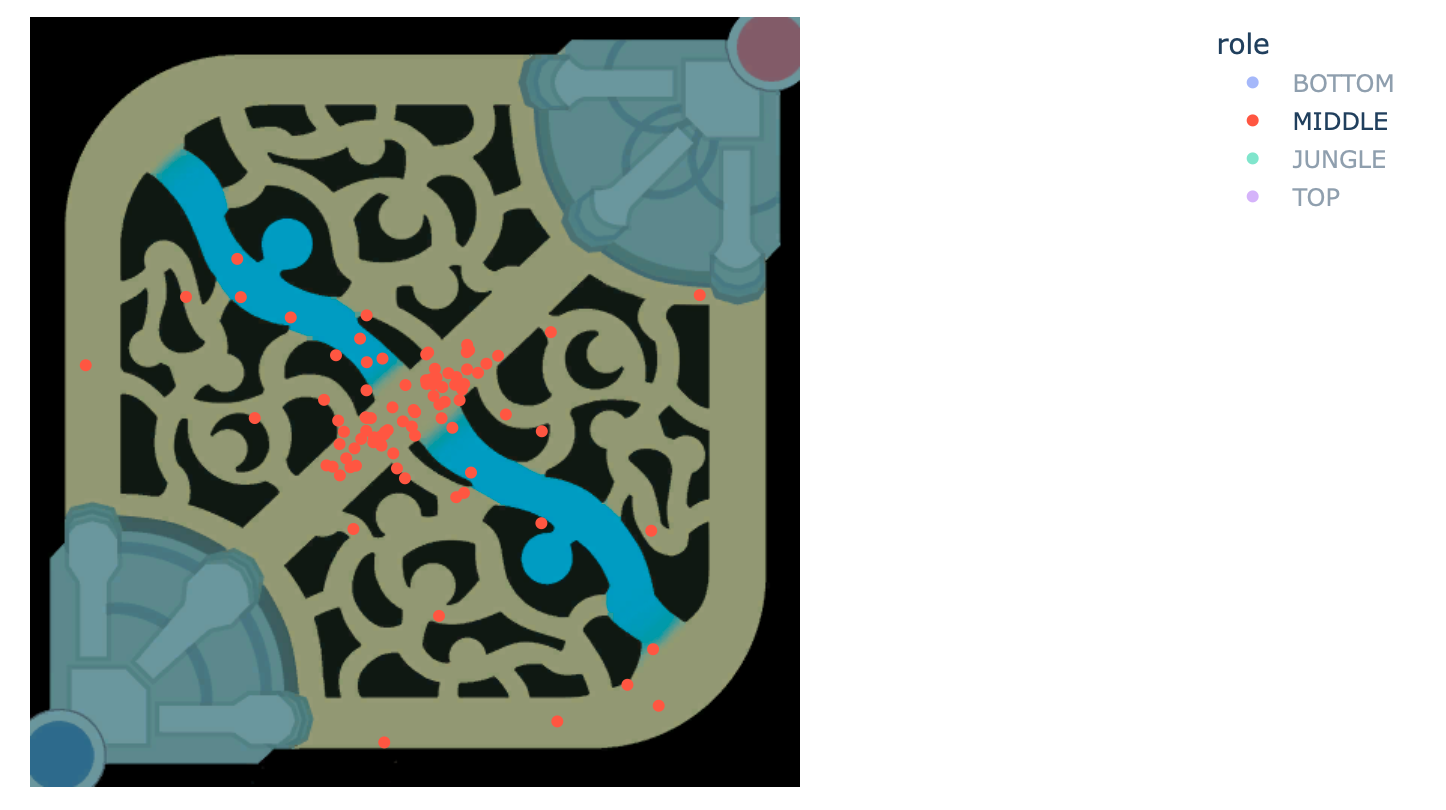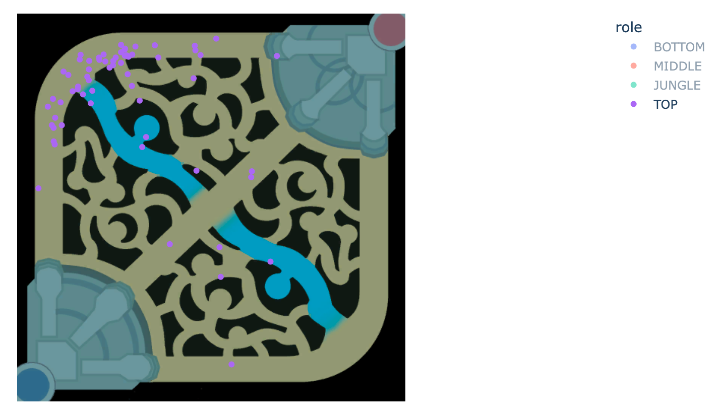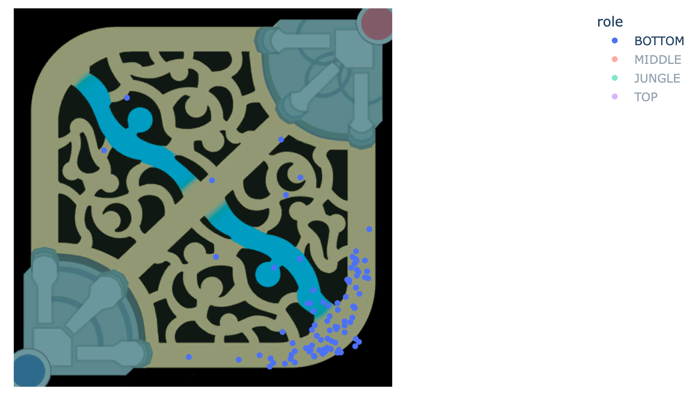 ‘match_id’ : 매치 아이디 ‘match_type’ : 매치 유형 (총력전, 일반…) ‘role’ : 위 데이터 프레임의 individual_position 값 ‘timestamp’ : 죽은 시간 ‘position_x’ : 죽었을 때의 x 좌표 ‘position_y’ : 죽었을 때의 y 좌표