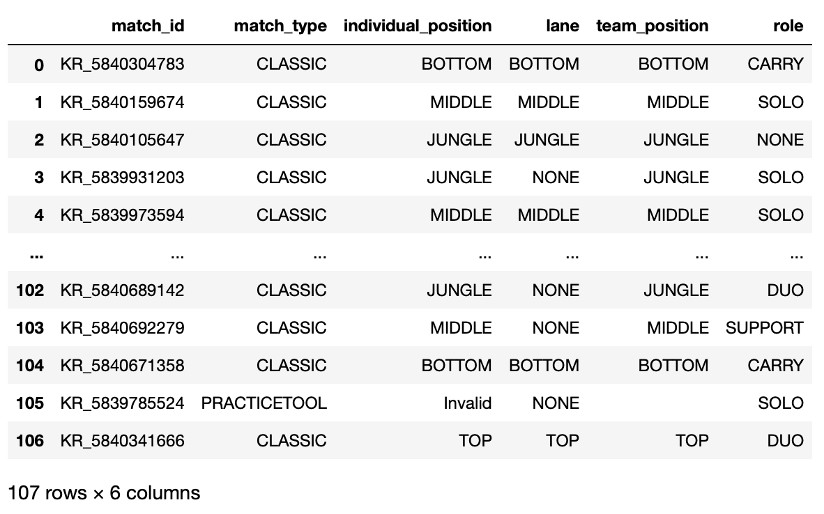 ‘match_id’ : 매치 아이디 ‘match_type’ : 매치 유형 (총력전, 일반) ‘individual_position’ : 포지션 ‘lane’ : 주 lane ‘team_position’ : 팀 포지션 (TOP, BOTTOM…) ‘role’ : 역할 (SOLO,DUO,CARRY…..)