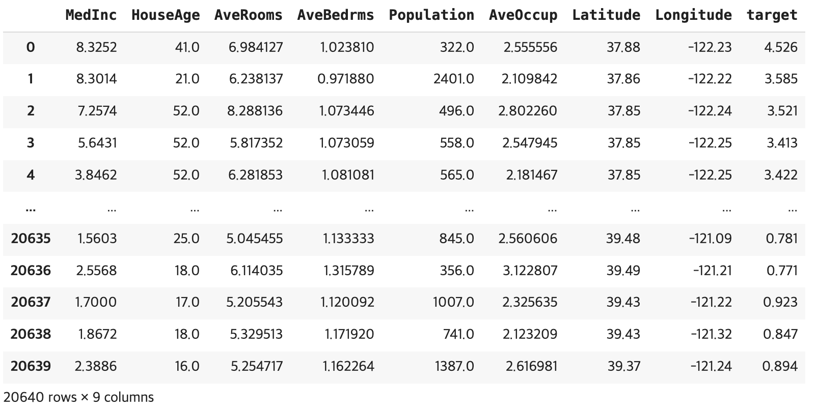 X = dataFrame.iloc[:,:8].values # target을 제외한 특징 8개