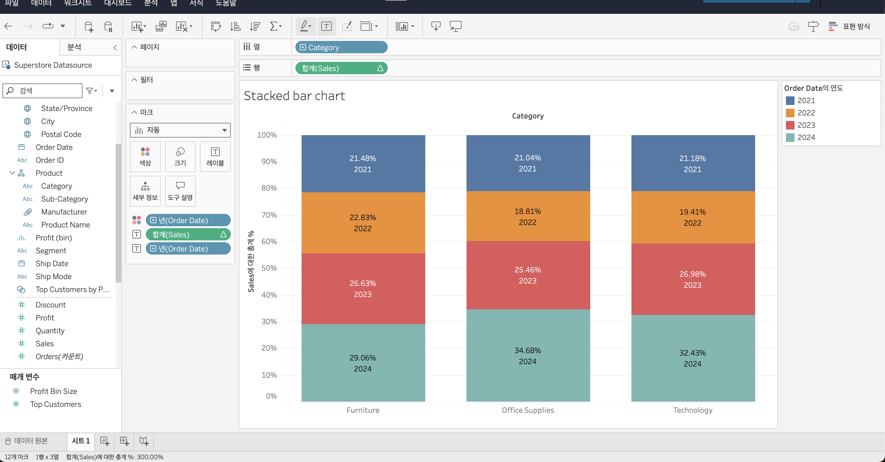 I created a stacked bar chart using the “Superstore Datasource” in Tableau to visualize yearly sales by category. The proportion of sales for each year is labeled, and the colors are used to distinguish between the categories.